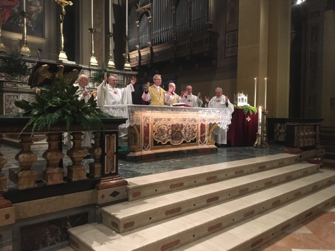Alle 18, in una chiesa parrocchiale attenta e partecipe, è stata celebrata la Messa del Patrono, presieduta da mons. Francesco Cavina, vescovo di Carpi (città natale di san Bernardino), con la presenza delle autorità cittadine e la tradizionale offerta del cero.