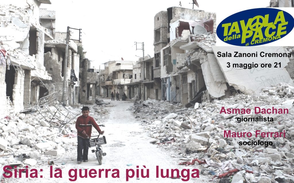«Siria: la guerra più lunga. Le responsabilità, le complicità, le vittime,i profughi». Questo il titolo dell’incontro che si terrà mercoledì 3 maggio, alle ore 21, presso la Sala Zanoni di via Vecchio Passeggio 1 a Cremona. Promosso dalla Tavola della Pace con capofila le Acli provinciali, l’appuntamento vedrà la presenza di Asmae Dachan giornalista professionista e scrittrice italo-siriana, nata ad Ancona nel 1976. La donna è stata direttore responsabile del mensile marchigiano «ML – Mondo Lavoro» ed è autrice del blog «Diario di Siria» (https://diariodisiria.com/). Dal 2016 lavora come freelance per diverse testate regionali e nazionali, tra cui il settimanale Panorama e il quotidiano Fatto Quotidiano, Antimafia2000 e Tellus Folio.