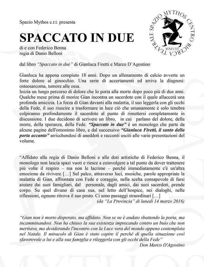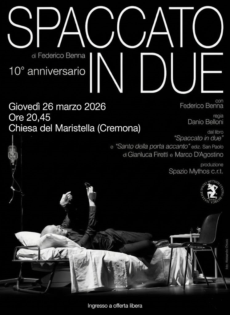 Sono passati undici anni dalla morte di Gianluca Firetti e dall’uscita del suo libro “Spaccato in due”, scritto a quattro mani con don Marco D’Agostino. In questo contesto giovedì 26 marzo, alle 20.45 nella chiesa del Maristella, a Cremona, sarà riproposto il monologo teatrale tratto dal libro “Spaccato in due” e che da questo testo prende il nome. A portare in scena lo spettacolo, regia di Danio Belloni, l’attore cremonese Federico Benna.