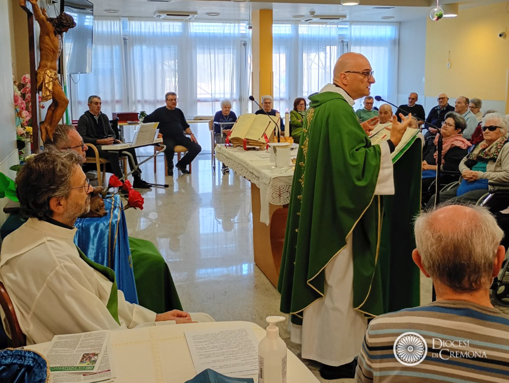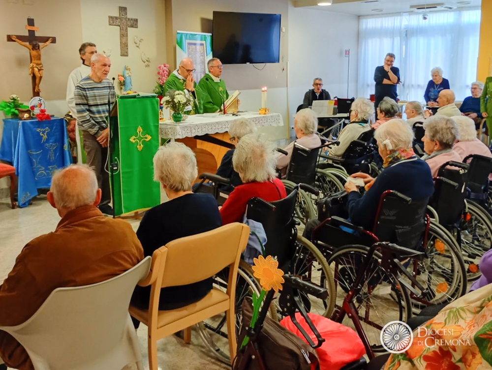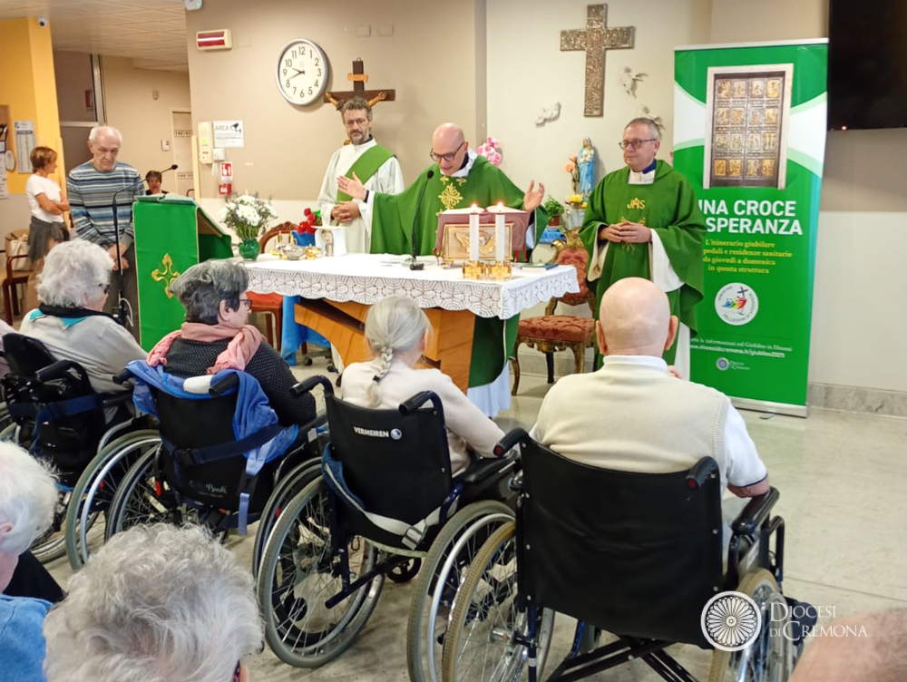 La Messa delle 9.30 di domenica 5 ottobre, nel salone della RSA Brunenghi di Castelleone, presieduta da don Maurizio Lucini, responsabile diocesano della Pastorale della salute, concelebrata con il parroco di Castelleone, don Giambattista Piacentini, ha chiuso l’iniziativa “Una croce di speranza”, che porta la Croce del Giubileo nelle case di riposo del territorio. Dal momento che gli ospiti delle RSA non possono partecipare al Giubileo a Roma, si è cercato un modo per coinvolgerli ed è questo il senso di “Una croce di speranza”.