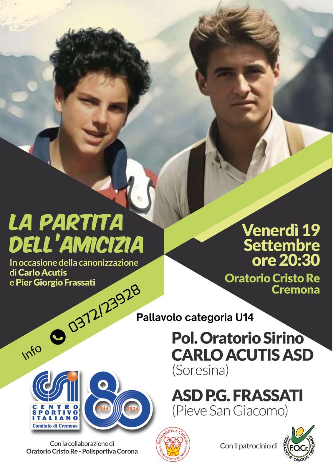 Sarà una serata di sport, festa, amicizia, che sarebbe piaciuta ai santi Pier Giorgio Frassati e Carlo Acutis, quella di venerdì 19 settembre alle ore 20.30 presso la palestra dell’Oratorio di Cristo Re a Cremona. Una modalità sportiva per festeggiare la canonizzazione di due giovani di cui le società sportive degli oratori di Pieve San Giacomo e Soresina portano il nome.
