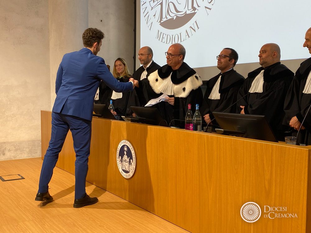 Seduto nelle prime file c’è anche il sindaco di Cremona, Gianluca Galimberti, che risponde al saluto dei docenti e, sorridendo, si alza per far passare Chiara Addis. Una dei due studenti cremonesi, insieme a Matteo Borghesi Alquati, tra questi primi undici laureati. Gli altri provengono da Aosta e da Foggia, passando per Venezia, Brescia, Lecco, Lucca, Macerata, Terni, a dimostrazione di quanto l’offerta formativa dell’ateneo apra gli orizzonti della città che proprio negli ultimi anni sta scoprendo la sua rinnovata vocazione universitaria.