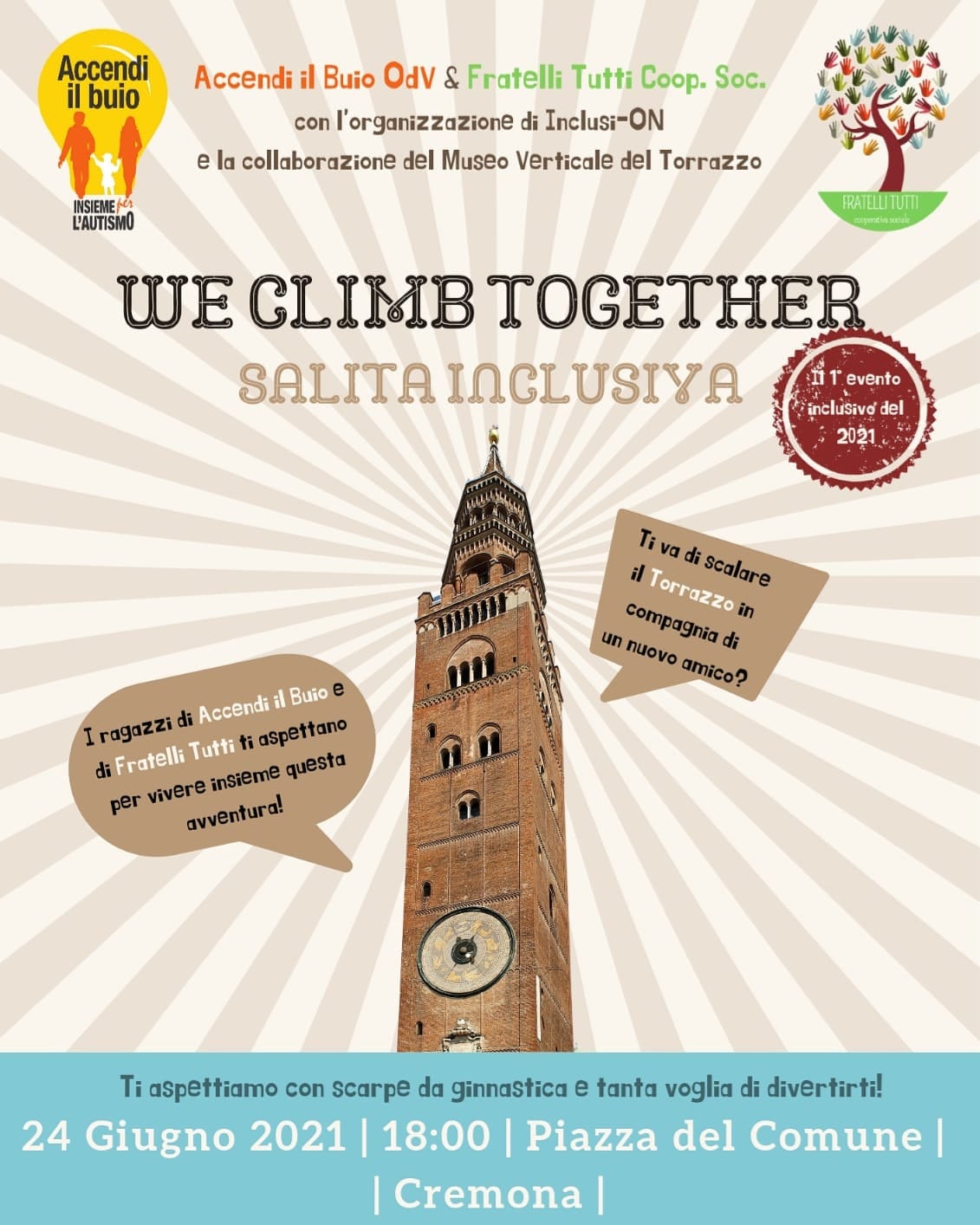 We Climb Together, il primo evento inclusivo della città di Cremona, avrà una location molto speciale con la salita al Torrazzo. L’evento è stato organizzato dall’organizzazione Inclusi-ON in collaborazione con il Museo Verticale del Torrazzo: punto di partenza in piazza del Comune alle ore 18 di giovedì 24 giugno dove sarà allestita la postazione di partenza: l’evento è stato pensato per sostenere le due realtà associative Fratelli Tutti Cooperativa sociale ed Accendi il Buio.